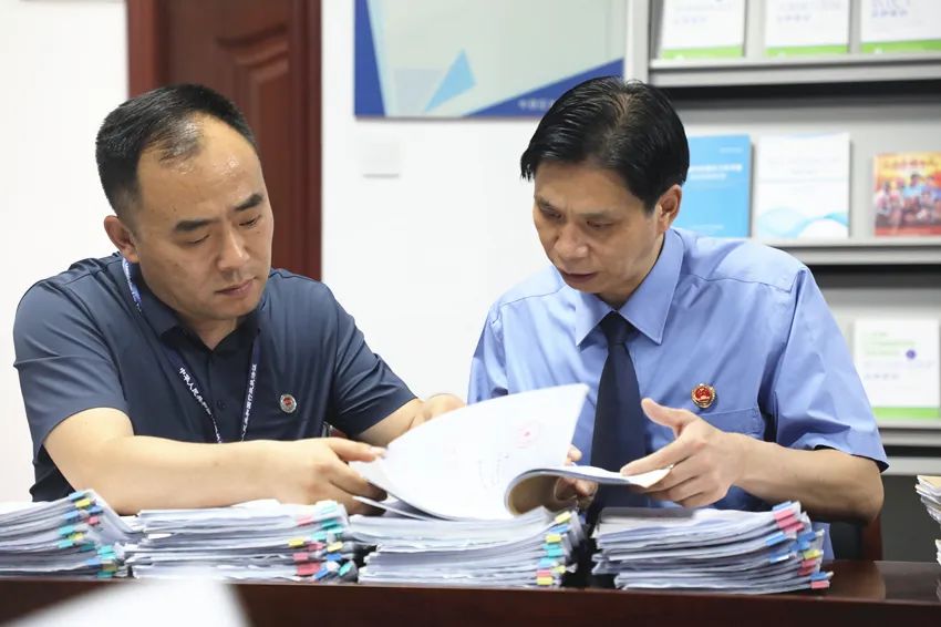 检察人员同社区矫正工作人员查阅社区矫正对象档案。
