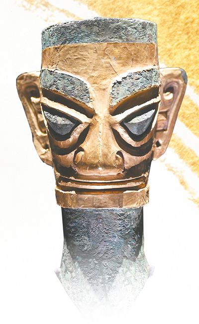 三星堆博物馆新馆的戴金面罩青铜人头像。 |