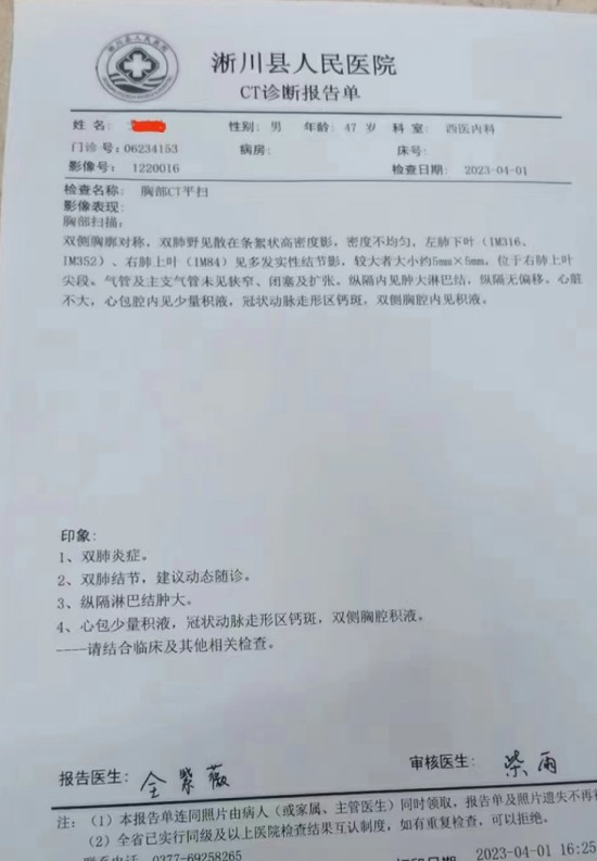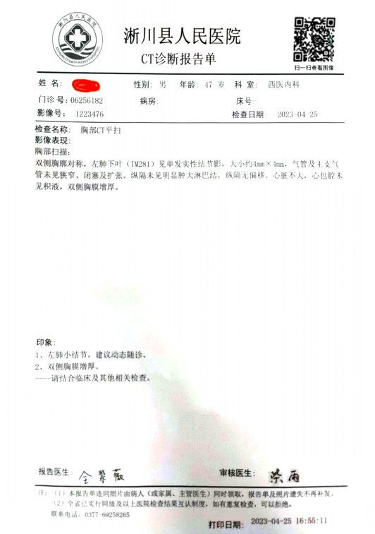 徒手调理项目开展以来,为广大亚健康患者提供了优质服务,同时也为诸多患者解除了隐疾。在该院徒手理疗室遇到一患者,该患者称:自己2023年4月1日,在医院被检查出,双肺野见散在条絮状高密度影,密度不均匀,左肺下叶(IM316、IM352)、右肺上叶(IM84)见多发实性结节影,较大者大小约5mm×5mm,位于右肺上叶尖段。气管及主支气管未见狭窄、闭塞及扩张。纵隔内见肿大淋巴结,纵隔无偏移。心脏不大,心包腔内见少量积液,冠状动脉走形区钙斑,双侧胸腔内见积液。被医院诊断为双肺炎症、纵隔淋巴结肿大、心包少量积液,冠状动脉走形区钙斑,双侧胸腔积液,当时医院要求自己住院治疗。后通过中医推荐,通过徒手治疗来解除病患。2023年4月5日,自己在徒手理疗师的精心细致的调理后,2023年4月25日再次检查下,发现自己双侧胸廓对称,左肺下叶(IM281)见单发实性结节影,大小约4mm×4mm,气管及主支气管未见狭窄、闭塞及扩张。纵隔未见明显肿大淋巴结,纵隔无偏移。心脏不大,心包腔未见积液,双侧胸膜增厚。该结果超乎我的想象,我深感中医徒手治疗的神奇,为我解除了疾患。为了进一步巩固和预防疾病的发生,目前我有时间就来做理疗,相信在徒手治疗师的调理下,我的身体会更健康,未来的生活会更美好。